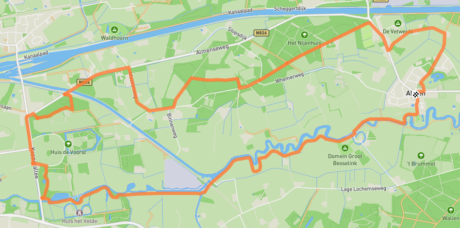Wandelroute De Hoofdige Boer 15 kilometer (totale route is 21 km, stuk door Zutphen niet gelopen) 30 december 2020 Rondwandeling, Hanzestedenpad etappe B Almen (nabij dorpskerk). Officiële start in Zutphen Bekijk op kaart Naar routebeschrijving GPX downloaden