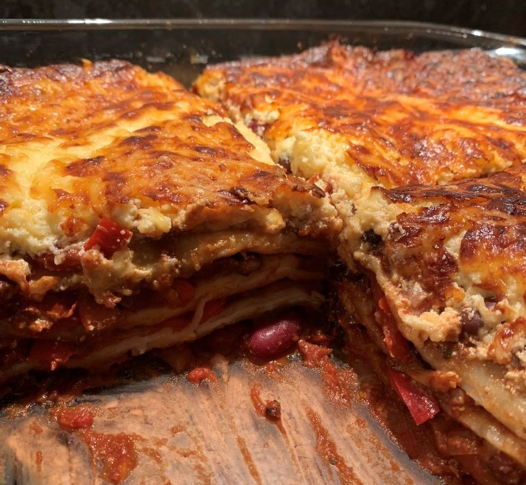- Ga zo door tot alles op is, maar bewaar een klein beetje saus voor bovenop de laatste tortilla laag.