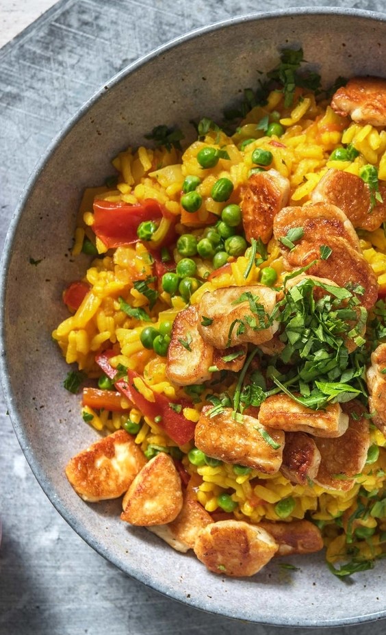 • Serveer de paella en schep de halloumiblokjes erop.