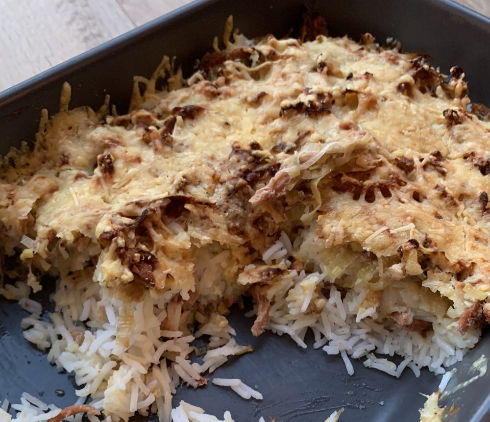 Schep in een ovenschaal achtereenvolgens de helft van de gekookte rijst, de helft van het preimengsel en daarover de halve hoeveelheid kaas.
