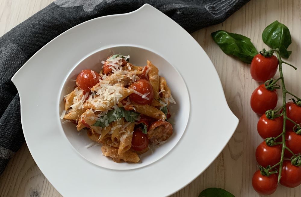 Romige pasta met ricotta, paprika en kerstomaatjes
