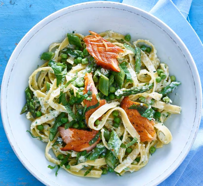 Tagliatelle met groene groenten en warmgerookte zalm