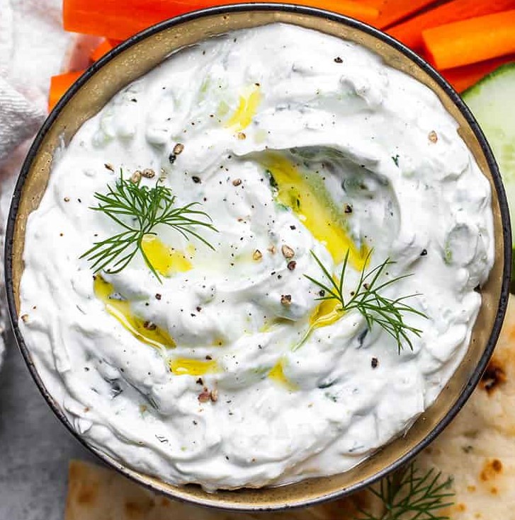 • Doe de yoghurt in een kom en voeg de uitgelekte komkommer, de knoflook, munt, dille en olijfolie toe.